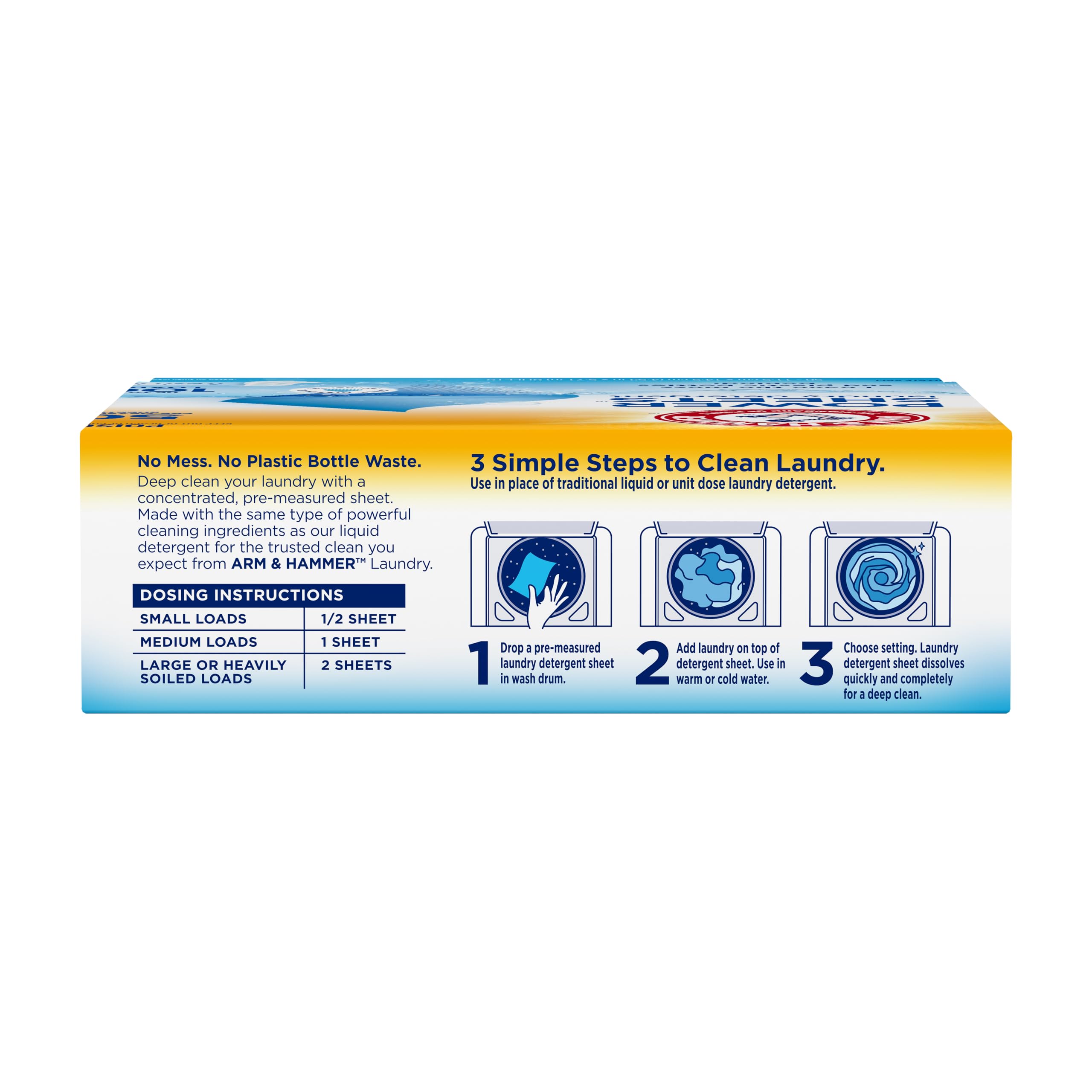 Arm & Hammer Power Sheets Laundry Detergent makes laundry day effortless with ultra-concentrated, pre-measured sheets that deliver a powerful clean without the plastic waste! Each sheet dissolves quickly in any water temperature, tackling tough stains and odours while leaving your clothes fresh with a light Fresh Linen scent. Designed for all washing machines, including high-efficiency models, these mess-free detergent sheets make measuring a thing of the past. Simply toss a sheet into the drum and let the power of Arm & Hammer do the rest.