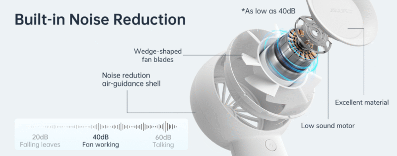 - Powerful & Energy-efficient: JISULIFE Personal Handheld Fan features a high-performance motor and optimized air duct to improve wind power while minimizing noise. Compared to other handheld fans, it has a faster speed (6100 r/min) and stronger wind (4.8 m/s)